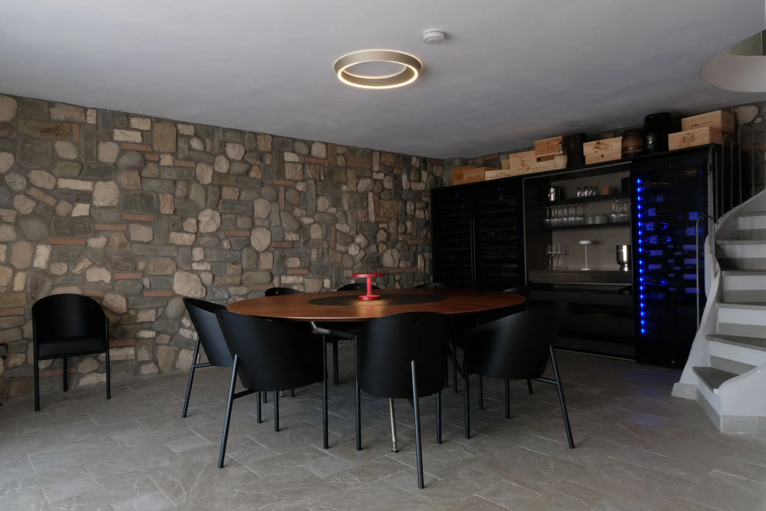 Spisebordet kan trekkes ut slik at det er plass til 10-12 personer. Stolene er fra Philippe Starck.