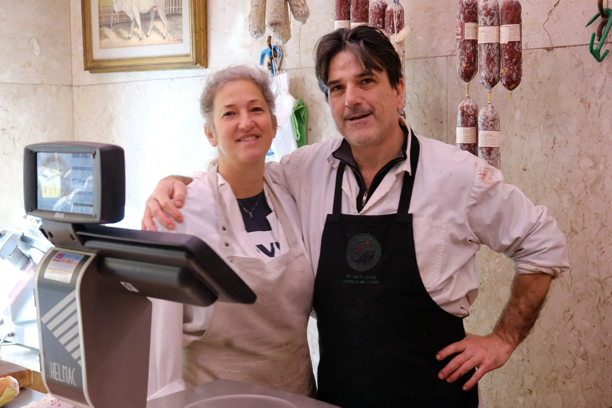 Simone og Barbara må være verdens lykkeligste par, og sammen driver de slakterbutikken i samme gaten hvor Casa Lari er.