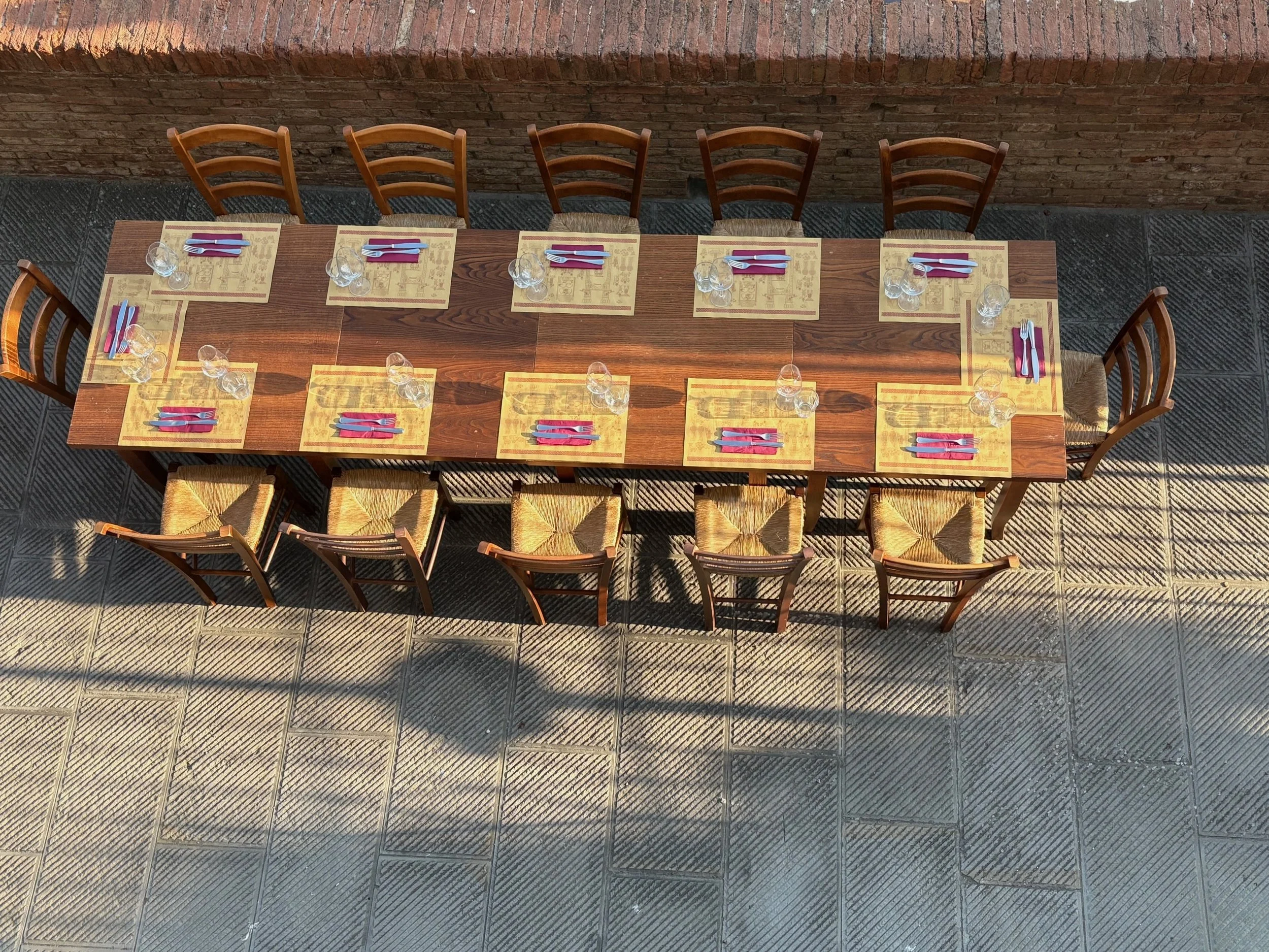 I Burratinai - har dekket opp langbord utenfor restauranten, idag er det bursdagsfeiring og 40 gjester som alle skal ha plass ute å spise.